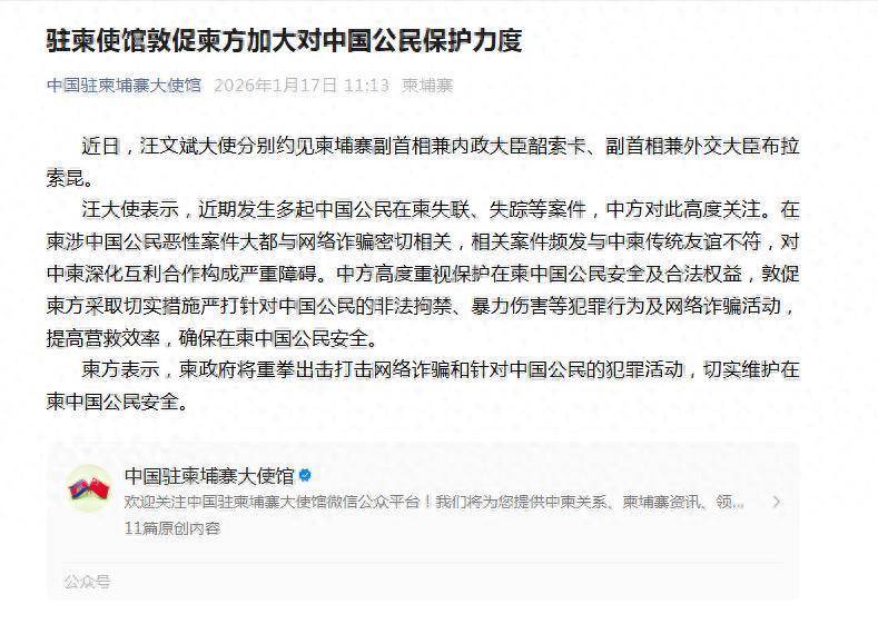 1月17日点金网,中国驻柬埔寨大使馆发文《驻柬使馆敦促柬方加大对中国公民保护力度》: