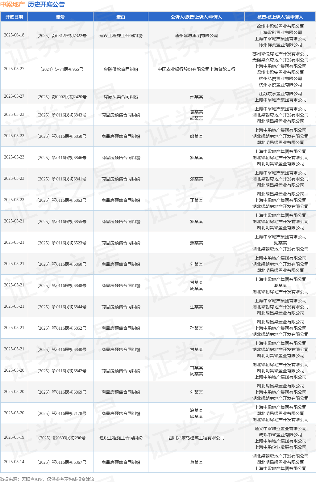 案号:(2025)鄂0116民初6367号审理法院:武汉市黄陂区人民法院案由:商品房预售合同纠纷当事人信息: 原告/上诉人:葛某某 被告/被上诉人:湖北梁朝房地产开发有限公司、湖北明昌梁置业有限公司、上海中梁地产集团有限公司开庭日期:2025年5月14日根据统计,近一年内以上海中梁地产集团有限公司为当事人的历史开庭公告有201则,其中案由为“商品房预售合同纠纷”的公告以112则居首,其次为“建设工程施工合同纠纷”有22则,“买卖合同纠纷”有18则。历史开庭公告(前20条)如下: